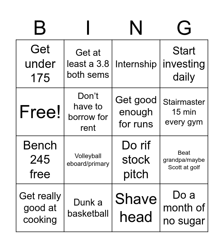 This bingo card has 16 words: Dunk a basketball, Beat grandpa/maybe Scott at golf, Internship, Get under 175, Bench 245 free, Get at least a 3.8 both sems, Do rif stock pitch, Shave head, Free!, Don’t have to borrow for rent, Get really good at cooking, Start investing daily, Volleyball eboard/primary, Stairmaster 15 min every gym, Get good enough for runs and Do a month of no sugar.