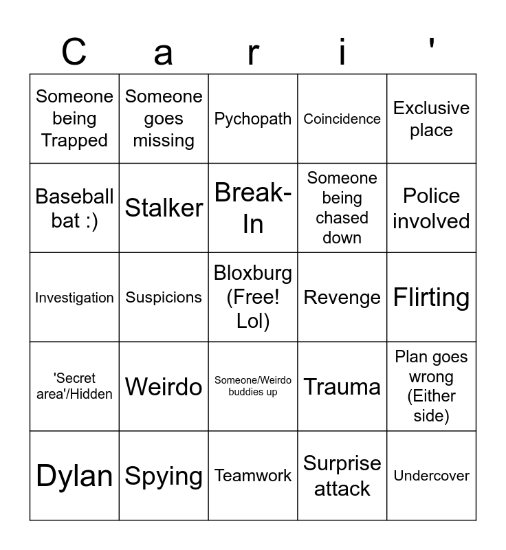 This bingo card has a free space and 29 words: Dylan, Gets Caught, Suspicions, Violence/Gets knocked out, Someone being Trapped, Pychopath, Stalker, Weirdo, Revenge, Spying, Flirting, Undercover, Teamwork, Surprise attack, Police involved, Someone gets arrested, Someone/Weirdo buddies up, 'Secret area'/Hidden, Exclusive place, Investigation, Trauma, Someone close to Cari, Someone being chased down, Baseball bat :), Coincidence, Someone goes missing, Plan goes wrong (Either side), Break-In and Someone being disrespected.