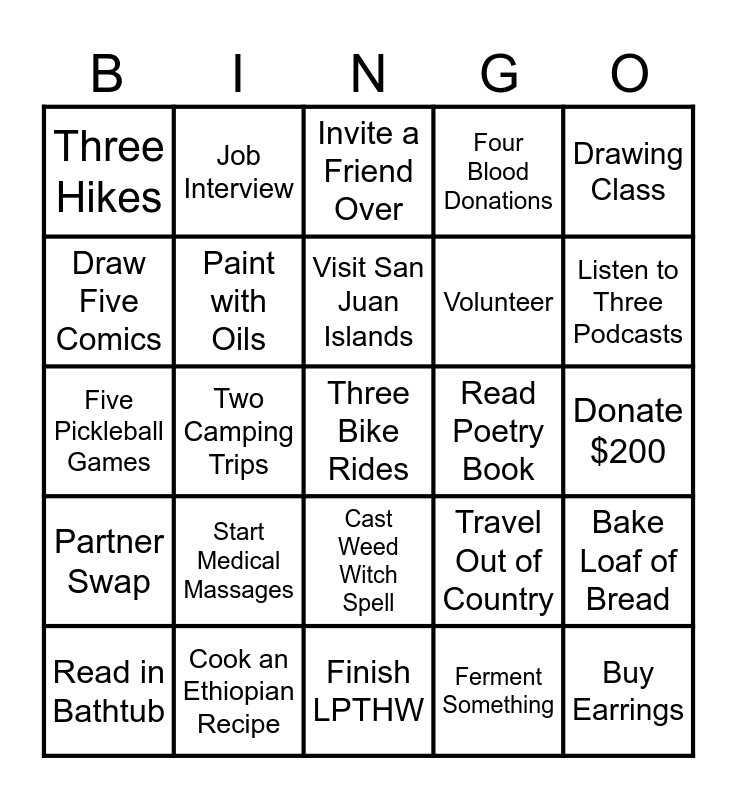 This bingo card has 25 words: Partner Swap, Cook an Ethiopian Recipe, Three Bike Rides, Ferment Something, Drawing Class, Three Hikes, Job Interview, Invite a Friend Over, Read Poetry Book, Bake Loaf of Bread, Draw Five Comics, Paint with Oils, Finish LPTHW, Travel Out of Country, Listen to Three Podcasts, Read in Bathtub, Two Camping Trips, Visit San Juan Islands, Volunteer, Donate $200, Five Pickleball Games, Start Medical Massages, Cast Weed Witch Spell, Four Blood Donations and Buy Earrings.