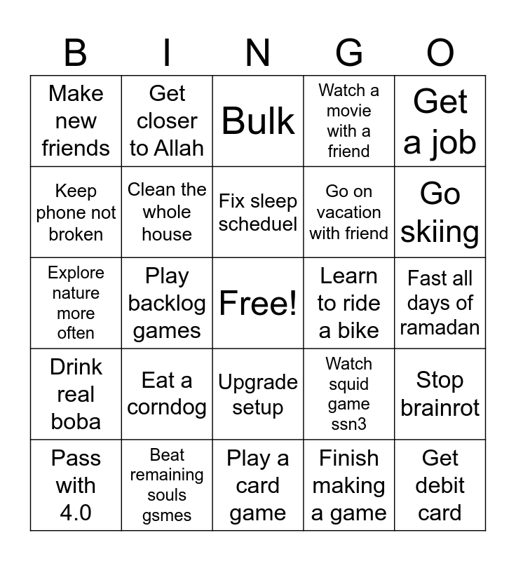 This bingo card has a free space and 24 words: Eat a corndog, Beat remaining souls gsmes, Fix sleep scheduel, Pass with 4.0, Get a job, Make new friends, Keep phone not broken, Get closer to Allah, Learn to ride a bike, Upgrade setup, Go on vacation with friend, Explore nature more often, Watch squid game ssn3, Stop brainrot, Clean the whole house, Finish making a game, Fast all days of ramadan, Bulk, Go skiing, Play backlog games, Get debit card, Drink real boba, Watch a movie with a friend and Play a card game.