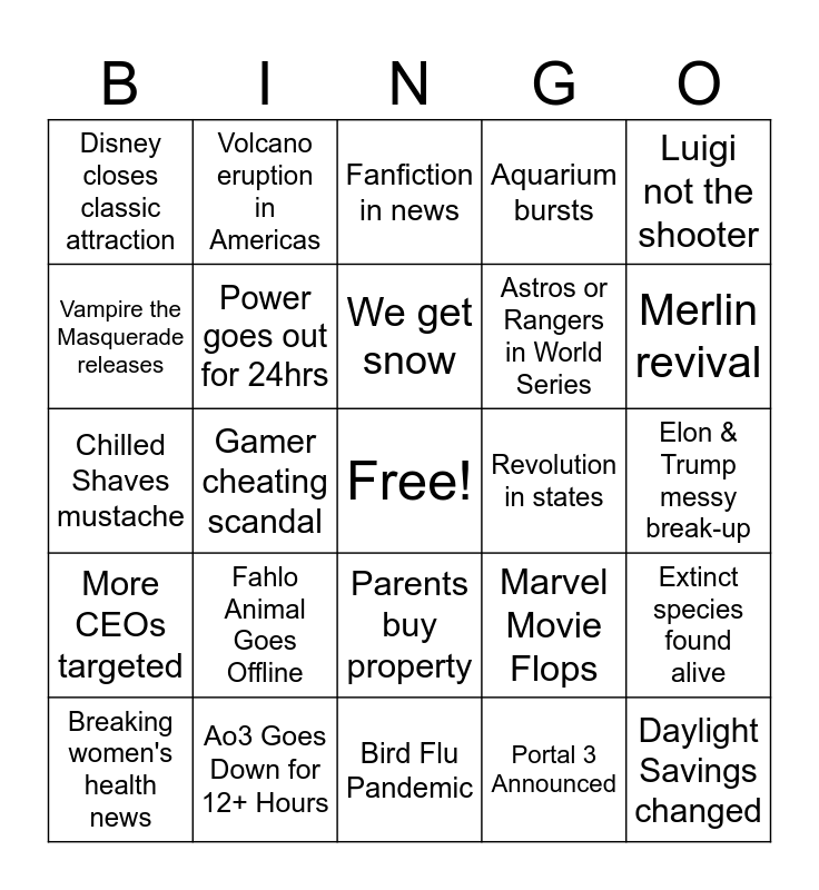 This bingo card has a free space and 24 words: Fahlo Animal Goes Offline, Ao3 Goes Down for 12+ Hours, We get snow, Breaking women's health news, Luigi not the shooter, Disney closes classic attraction, Vampire the Masquerade releases, Volcano eruption in Americas, Revolution in states, Parents buy property, Astros or Rangers in World Series, Chilled Shaves mustache, Marvel Movie Flops, Extinct species found alive, Power goes out for 24hrs, Portal 3 Announced, Elon & Trump messy break-up, Fanfiction in news, Merlin revival, Gamer cheating scandal, Daylight Savings changed, More CEOs targeted, Aquarium bursts and Bird Flu Pandemic.