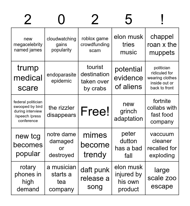 This bingo card has a free space and 24 words: notre dame damaged or destroyed, a musician starts a tea company, tourist destination taken over by crabs, rotary phones in high demand, chappel roan x the muppets, new megacelebrity named james, trump medical scare, cloudwatching gains popularity, new grinch adaptation, mimes become trendy, potential evidence of aliens, federal politician swooped by bird during interview /speech /press conference, peter dutton has a bad fall, vaccuum cleaner recalled for exploding, endoparasite epidemic, elon musk injured by his own product, fortnite collabs with fast food company, roblox game crowdfunding scam, politician ridiculed for wearing clothes inside out or back to front, the rizzler disappears, large scale zoo escape, new tcg becomes popular, elon musk tries music and daft punk release a song.