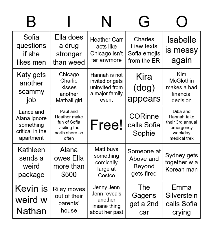 This bingo card has a free space and 24 words: Alana owes Ella more than $500, Riley moves out of their parents’ house, Hannah is not invited or gets uninvited from a major family event, Kevin is weird w Nathan, Isabelle is messy again, Sofia questions if she likes men, Katy gets another scammy job, Ella does a drug stronger than weed, CORinne calls Sofia Sophie, Matt buys something comically large at Costco, Kira (dog) appears, Lance and Alana ignore something critical in the apartment, Someone at Above and Beyond gets fired, Sydney gets together w a Korean man, Chicago Charlie kisses another Matball girl, The Gagens get a 2nd car, Diba and Hannah take their 3rd annual emergency weekday medical trek, Heather Carr acts like Chicago isn’t far anymore, Kim McGlothin makes a bad financial decision, Paul and Heather make fun of Sofia visiting the north shore so often, Emma Silverstein calls Sofia crying, Kathleen sends a weird package, Charles Liaw texts Sofia emojis from the ER and Jenny Jenn Jenn reveals another insane thing about her past.