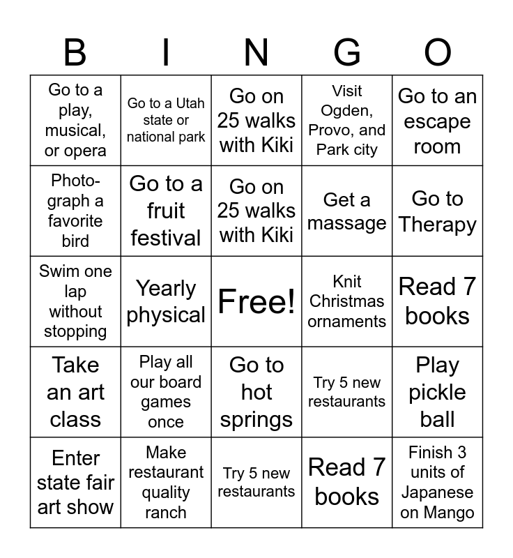 This bingo card has a free space and 24 words: Play all our board games once, Make restaurant quality ranch, Go on 25 walks with Kiki, Enter state fair art show, Go to an escape room, Go to a play, musical, or opera, Photo- graph a favorite bird, Go to a Utah state or national park, Knit Christmas ornaments, Go to hot springs, Get a massage, Swim one lap without stopping, Try 5 new restaurants, Play pickle ball, Go to a fruit festival, Read 7 books, Read 7 books, Go on 25 walks with Kiki, Go to Therapy, Yearly physical, Finish 3 units of Japanese on Mango, Take an art class, Visit Ogden, Provo, and Park city and Try 5 new restaurants.