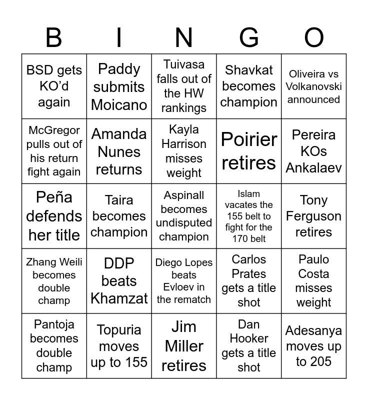 This bingo card has a free space and 24 words: DDP beats Khamzat, Topuria moves up to 155, Kayla Harrison misses weight, Pantoja becomes double champ, Oliveira vs Volkanovski announced, BSD gets KO’d again, McGregor pulls out of his return fight again, Paddy submits Moicano, Islam vacates the 155 belt to fight for the 170 belt, Diego Lopes beats Evloev in the rematch, Poirier retires, Peña defends her title, Carlos Prates gets a title shot, Paulo Costa misses weight, Amanda Nunes returns, Dan Hooker gets a title shot, Tony Ferguson retires, Tuivasa falls out of the HW rankings, Pereira KOs Ankalaev, Taira becomes champion, Adesanya moves up to 205, Zhang Weili becomes double champ, Shavkat becomes champion and Jim Miller retires.