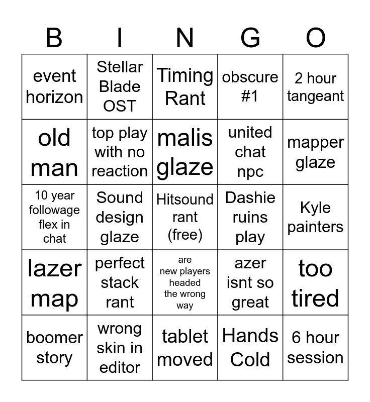 This bingo card has a free space and 24 words: perfect stack rant, wrong skin in editor, malis glaze, boomer story, 2 hour tangeant, event horizon, old man, Stellar Blade OST, Dashie ruins play, are new players headed the wrong way, united chat npc, 10 year followage flex in chat, azer isnt so great, too tired, top play with no reaction, Hands Cold, Kyle painters, Timing Rant, mapper glaze, Sound design glaze, 6 hour session, lazer map, obscure #1 and tablet moved.