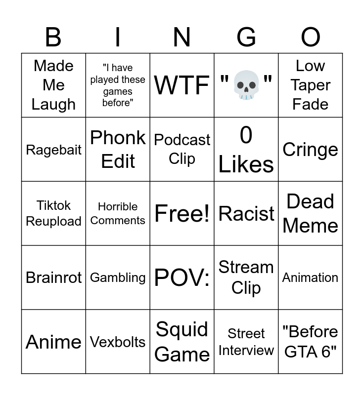 This bingo card has a free space and 24 words: Gambling, Vexbolts, Podcast Clip, Anime, Low Taper Fade, Made Me Laugh, Ragebait, "I have played these games before", Racist, POV:, 0 Likes, Tiktok Reupload, Stream Clip, Animation, Phonk Edit, Street Interview, Dead Meme, WTF, Cringe, Horrible Comments, "Before GTA 6", Brainrot, "💀" and Squid Game.