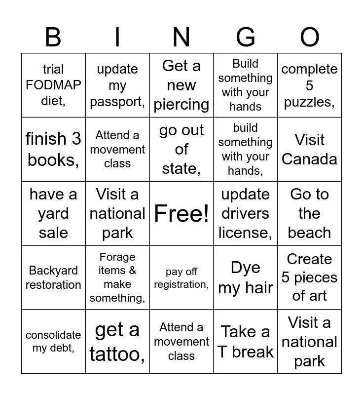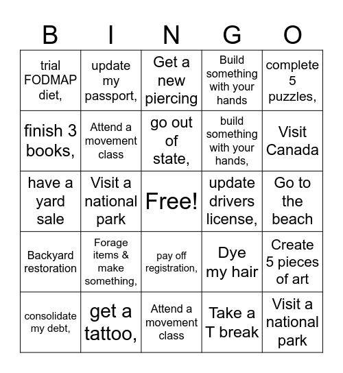 This bingo card has a free space and 24 words: Forage items & make something,, get a tattoo,, go out of state,, consolidate my debt,, complete 5 puzzles,, trial FODMAP diet,, finish 3 books,, update my passport,, update drivers license,, pay off registration,, build something with your hands,, have a yard sale, Dye my hair, Create 5 pieces of art, Attend a movement class, Take a T break, Go to the beach, Get a new piercing, Visit Canada, Visit a national park, Visit a national park, Backyard restoration, Build something with your hands and Attend a movement class.