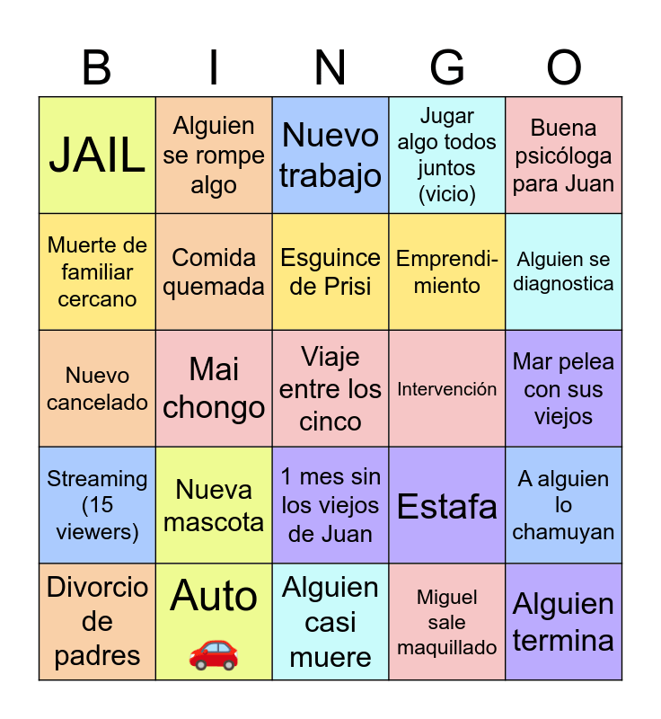This bingo card has a free space and 24 words: Nueva mascota, Auto 馃殫, Esguince de Prisi, Divorcio de padres, Buena psic贸loga para Juan, JAIL, Muerte de familiar cercano, Alguien se rompe algo, Intervenci贸n, 1 mes sin los viejos de Juan, Emprendi- miento, Nuevo cancelado, Estafa, A alguien lo chamuyan, Comida quemada, Miguel sale maquillado, Mar pelea con sus viejos, Nuevo trabajo, Alguien se diagnostica, Mai chongo, Alguien termina, Streaming (15 viewers), Jugar algo todos juntos (vicio) and Alguien casi muere.
