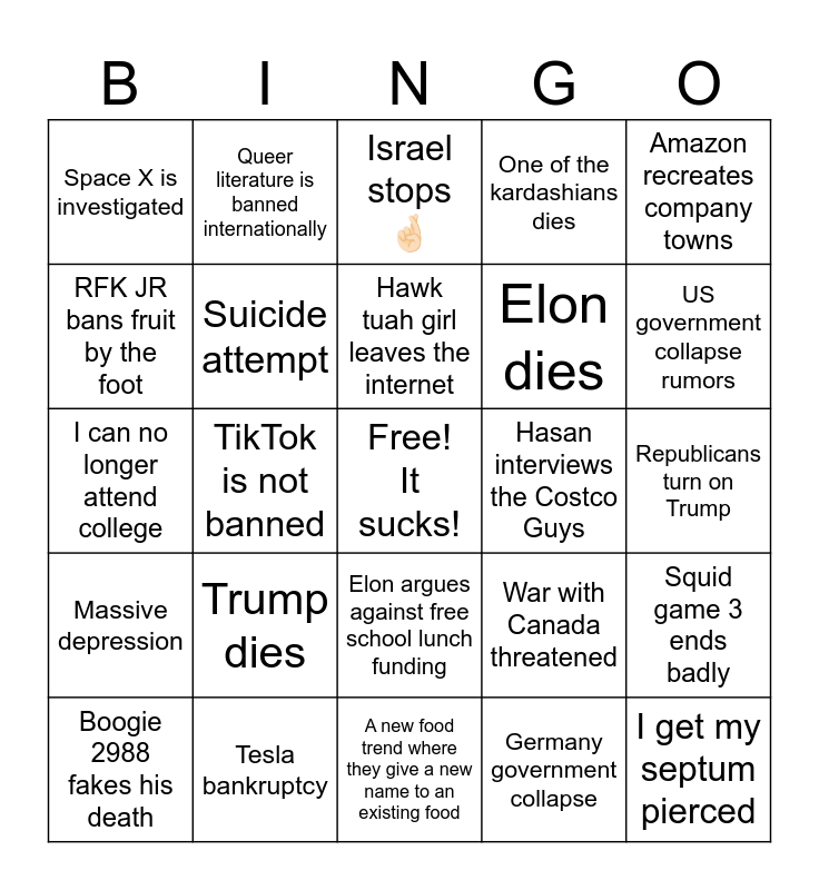 This bingo card has a free space and 24 words: Trump dies, Tesla bankruptcy, Hawk tuah girl leaves the internet, Boogie 2988 fakes his death, Amazon recreates company towns, Space X is investigated, RFK JR bans fruit by the foot, Queer literature is banned internationally, Hasan interviews the Costco Guys, Elon argues against free school lunch funding, Elon dies, I can no longer attend college, War with Canada threatened, Squid game 3 ends badly, Suicide attempt, Germany government collapse, Republicans turn on Trump, Israel stops 🤞🏻, US government collapse rumors, TikTok is not banned, I get my septum pierced, Massive depression, One of the kardashians dies and A new food trend where they give a new name to an existing food.