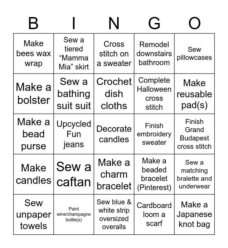 This bingo card has 25 words: Sew a caftan, Sew blue & white strip oversized overalls, Crochet dish cloths, Sew unpaper towels, Sew pillowcases, Make bees wax wrap, Make a bolster, Sew a tiered “Mamma Mia” skirt, Finish embroidery sweater, Make a charm bracelet, Complete Halloween cross stitch, Make a bead purse, Make a beaded bracelet (Pinterest), Sew a matching bralette and underwear, Sew a bathing suit suit, Make a Japanese knot bag, Finish Grand Budapest cross stitch, Cross stitch on a sweater, Make reusable pad(s), Upcycled Fun jeans, Decorate candles, Paint wine/champagne bottle(s), Make candles, Remodel downstairs bathroom and Cardboard loom a scarf.
