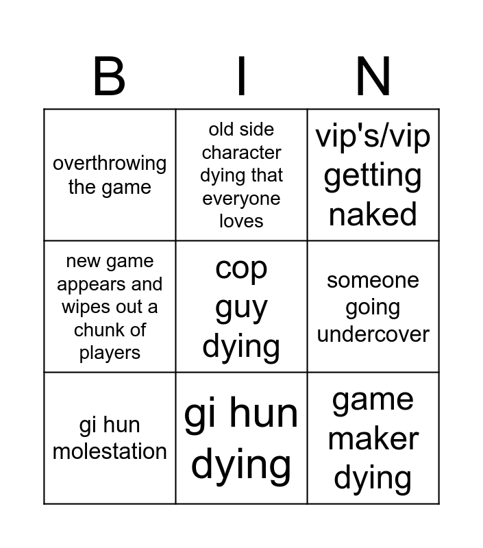 This bingo card has 10 words: gi hun dying, vip's/vip getting naked, overthrowing the game, cop guy dying, new game appears and wipes out a chunk of players, gi hun molestation, old side character dying that everyone loves, fake death, someone going undercover and game maker dying.