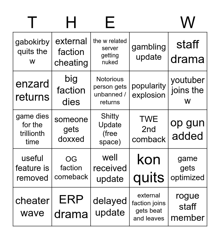 This bingo card has a free space and 24 words: OG faction comeback, ERP drama, Notorious person gets unbanned / returns, cheater wave, staff drama, gabokirby quits the w, enzard returns, external faction cheating, TWE 2nd comback, well received update, popularity explosion, game dies for the trillionth time, kon quits, game gets optimized, big faction dies, external faction joins gets beat and leaves, op gun added, the w related server getting nuked, youtuber joins the w, someone gets doxxed, rogue staff member, useful feature is removed, gambling update and delayed update.