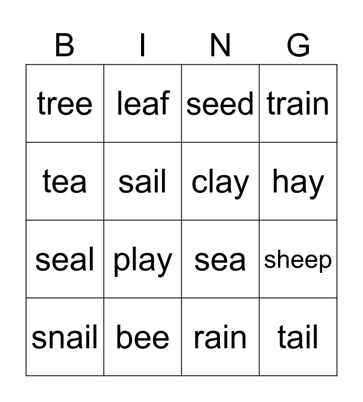 This bingo card has 16 words: bee, sheep, seed, tree, seal, leaf, sea, rain, tea, sail, snail, train, play, hay, clay and tail.