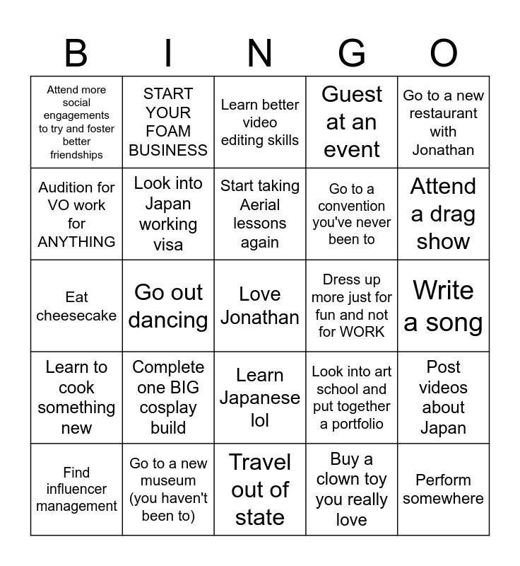 This bingo card has a free space and 24 words: Complete one BIG cosplay build, Go to a new museum (you haven't been to), Start taking Aerial lessons again, Find influencer management, Go to a new restaurant with Jonathan, Attend more social engagements to try and foster better friendships, Audition for VO work for ANYTHING, START YOUR FOAM BUSINESS, Dress up more just for fun and not for WORK, Learn Japanese lol, Go to a convention you've never been to, Eat cheesecake, Look into art school and put together a portfolio, Post videos about Japan, Look into Japan working visa, Buy a clown toy you really love, Write a song, Learn better video editing skills, Attend a drag show, Go out dancing, Perform somewhere, Learn to cook something new, Guest at an event and Travel out of state.