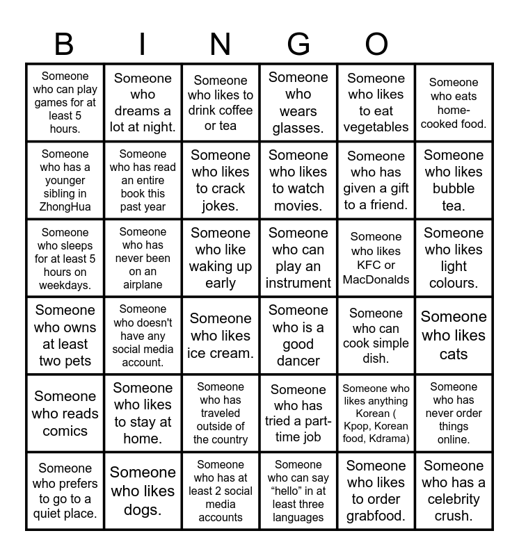 This bingo card has 36 words: Someone who has tried a part-time job, Someone who has traveled outside of the country, Someone who can say “hello” in at least three languages, Someone who has a younger sibling in ZhongHua, Someone who owns at least two pets, Someone who can play an instrument, Someone who has read an entire book this past year, Someone who has at least 2 social media accounts, Someone who likes to eat vegetables, Someone who likes anything Korean ( Kpop, Korean food, Kdrama), Someone who likes bubble tea., Someone who wears glasses., Someone who has never order things online., Someone who has never been on an airplane, Someone who likes to watch movies., Someone who can play games for at least 5 hours., Someone who reads comics, Someone who likes KFC or MacDonalds, Someone who sleeps for at least 5 hours on weekdays., Someone who likes to drink coffee or tea, Someone who like waking up early, Someone who doesn't have any social media account., Someone who is a good dancer, Someone who likes ice cream., Someone who can cook simple dish., Someone who dreams a lot at night., Someone who has given a gift to a friend., Someone who likes dogs., Someone who likes to crack jokes., Someone who eats home-cooked food., Someone who has a celebrity crush., Someone who prefers to go to a quiet place., Someone who likes cats, Someone who likes light colours., Someone who likes to stay at home. and Someone who likes to order grabfood..