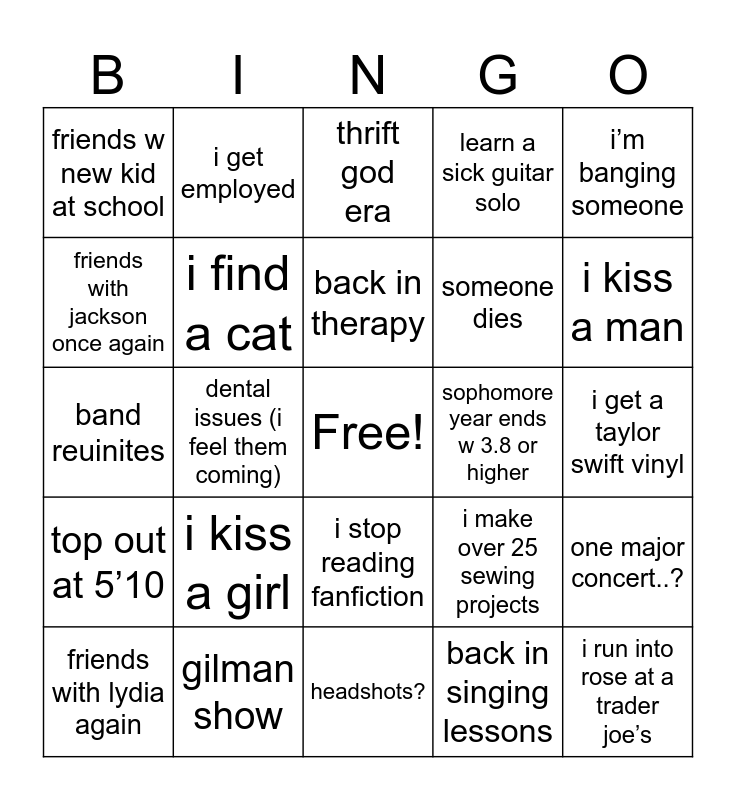 This bingo card has a free space and 24 words: i kiss a girl, gilman show, back in therapy, friends with lydia again, i’m banging someone, friends w new kid at school, friends with jackson once again, i get employed, sophomore year ends w 3.8 or higher, i stop reading fanfiction, someone dies, band reuinites, i make over 25 sewing projects, one major concert..?, i find a cat, back in singing lessons, i get a taylor swift vinyl, thrift god era, i kiss a man, dental issues (i feel them coming), i run into rose at a trader joe’s, top out at 5’10, learn a sick guitar solo and headshots?.
