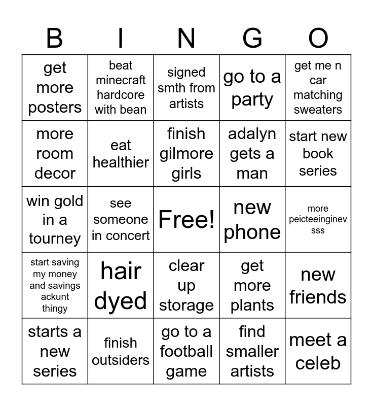 This bingo card has a free space and 24 words: hair dyed, finish outsiders, finish gilmore girls, starts a new series, get me n car matching sweaters, get more posters, more room decor, beat minecraft hardcore with bean, new phone, clear up storage, adalyn gets a man, win gold in a tourney, get more plants, new friends, eat healthier, find smaller artists, more peicteeinginev sss, signed smth from artists, start new book series, see someone in concert, meet a celeb, start saving my money and savings ackunt thingy, go to a party and go to a football game.