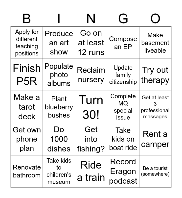 This bingo card has a free space and 24 words: Do 1000 dishes, Take kids to children's museum, Reclaim nursery, Renovate bathroom, Make basement liveable, Apply for different teaching positions, Finish P5R, Produce an art show, Complete MQ special issue, Get into fishing?, Update family citizenship, Make a tarot deck, Take kids on boat ride, Rent a camper, Populate photo albums, Record Eragon podcast, Get at least 3 professional massages, Go on at least 12 runs, Try out therapy, Plant blueberry bushes, Be a tourist (somewhere), Get own phone plan, Compose an EP and Ride a train.