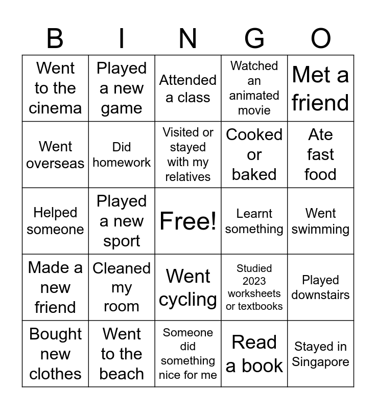 This bingo card has a free space and 24 words: Cleaned my room, Went to the beach, Visited or stayed with my relatives, Bought new clothes, Met a friend, Went to the cinema, Went overseas, Played a new game, Learnt something, Went cycling, Cooked or baked, Helped someone, Studied 2023 worksheets or textbooks, Played downstairs, Did homework, Read a book, Went swimming, Attended a class, Ate fast food, Played a new sport, Stayed in Singapore, Made a new friend, Watched an animated movie and Someone did something nice for me.