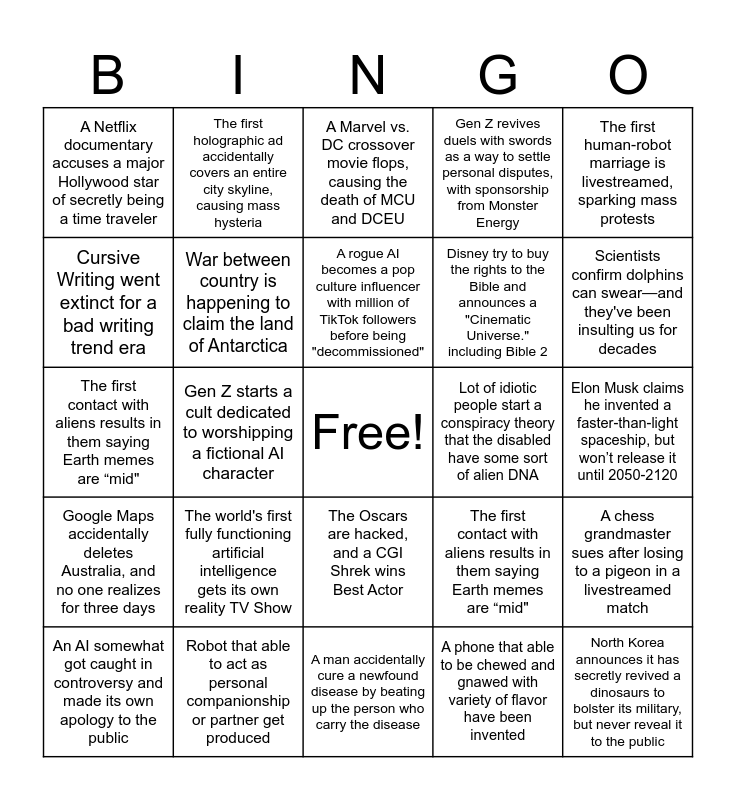 This bingo card has a free space and 24 words: The world's first fully functioning artificial intelligence gets its own reality TV Show, Robot that able to act as personal companionship or partner get produced, A rogue AI becomes a pop culture influencer with million of TikTok followers before being "decommissioned", An AI somewhat got caught in controversy and made its own apology to the public, The first human-robot marriage is livestreamed, sparking mass protests, A Netflix documentary accuses a major Hollywood star of secretly being a time traveler, Cursive Writing went extinct for a bad writing trend era, The first holographic ad accidentally covers an entire city skyline, causing mass hysteria, Lot of idiotic people start a conspiracy theory that the disabled have some sort of alien DNA, The Oscars are hacked, and a CGI Shrek wins Best Actor, Disney try to buy the rights to the Bible and announces a "Cinematic Universe." including Bible 2, The first contact with aliens results in them saying Earth memes are “mid", The first contact with aliens results in them saying Earth memes are “mid", A chess grandmaster sues after losing to a pigeon in a livestreamed match, War between country is happening to claim the land of Antarctica, A phone that able to be chewed and gnawed with variety of flavor have been invented, Elon Musk claims he invented a faster-than-light spaceship, but won’t release it until 2050-2120, A Marvel vs. DC crossover movie flops, causing the death of MCU and DCEU, Scientists confirm dolphins can swear—and they've been insulting us for decades, Gen Z starts a cult dedicated to worshipping a fictional AI character, North Korea announces it has secretly revived a dinosaurs to bolster its military, but never reveal it to the public, Google Maps accidentally deletes Australia, and no one realizes for three days, Gen Z revives duels with swords as a way to settle personal disputes, with sponsorship from Monster Energy and A man accidentally cure a newfound disease by beating up the person who carry the disease.