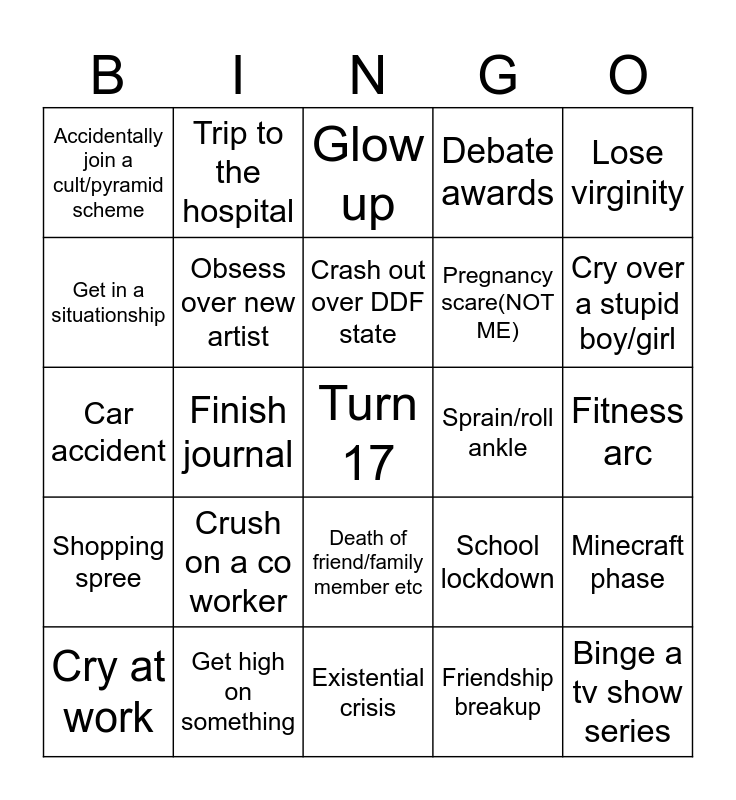 This bingo card has a free space and 24 words: Crush on a co worker, Get high on something, Crash out over DDF state, Cry at work, Lose virginity, Accidentally join a cult/pyramid scheme, Get in a situationship, Trip to the hospital, Sprain/roll ankle, Death of friend/family member etc, Pregnancy scare(NOT ME), Car accident, School lockdown, Minecraft phase, Obsess over new artist, Friendship breakup, Fitness arc, Glow up, Cry over a stupid boy/girl, Finish journal, Binge a tv show series, Shopping spree, Debate awards and Existential crisis.