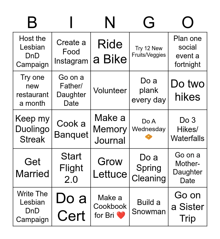 This bingo card has 25 words: Start Flight 2.0, Make a Cookbook for Bri ❤️, Volunteer, Write The Lesbian DnD Campaign, Plan one social event a fortnight, Host the Lesbian DnD Campaign, Try one new restaurant a month, Create a Food Instagram, Do A Wednesday 🧇, Grow Lettuce, Do a plank every day, Keep my Duolingo Streak, Do a Spring Cleaning, Go on a Mother-Daughter Date, Go on a Father/ Daughter Date, Go on a Sister Trip, Do 3 Hikes/ Waterfalls, Ride a Bike, Do two hikes, Cook a Banquet, Make a Memory Journal, Do a Cert, Get Married, Try 12 New Fruits/Veggies and Build a Snowman.
