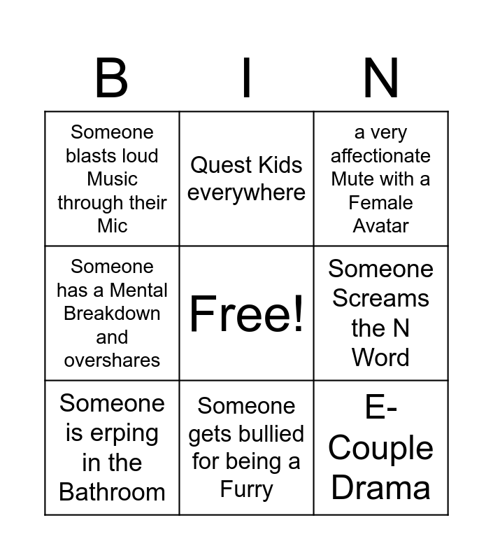 This bingo card has a free space and 8 words: Someone Screams the N Word, a very affectionate Mute with a Female Avatar, Quest Kids everywhere, Someone is erping in the Bathroom, Someone blasts loud Music through their Mic, E-Couple Drama, Someone has a Mental Breakdown and overshares and Someone gets bullied for being a Furry.