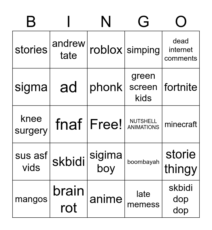 This bingo card has a free space and 24 words: skbidi, brain rot, phonk, mangos, dead internet comments, stories, sigma, andrew tate, NUTSHELL ANIMATIONS, sigima boy, green screen kids, knee surgery, boombayah, storie thingy, ad, late memess, minecraft, roblox, fortnite, fnaf, skbidi dop dop, sus asf vids, simping and anime.