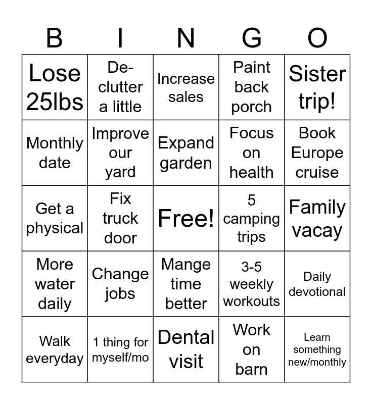 This bingo card has a free space and 24 words: Walk everyday, Change jobs, Expand garden, Work on barn, Sister trip!, Lose 25lbs, De-clutter a little, Increase sales, 5 camping trips, Family vacay, Get a physical, Improve our yard, 3-5 weekly workouts, Daily devotional, Monthly date, 1 thing for myself/mo, Dental visit, Paint back porch, Book Europe cruise, More water daily, Fix truck door, Mange time better, Focus on health and Learn something new/monthly.
