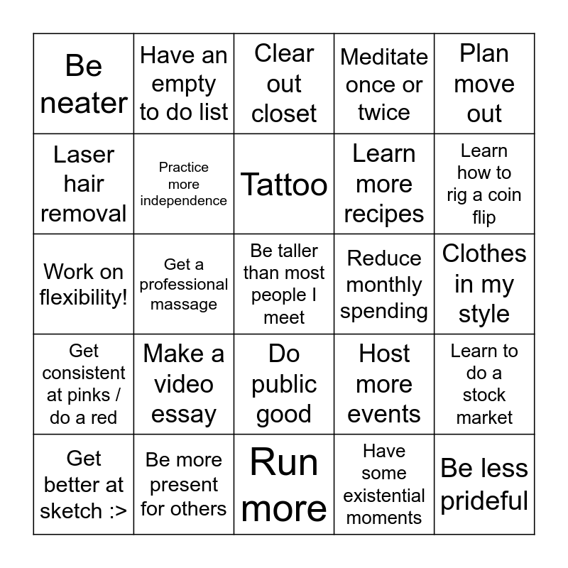 This bingo card has a free space and 24 words: Make a video essay, Be more present for others, Tattoo, Get better at sketch :>, Plan move out, Be neater, Laser hair removal, Have an empty to do list, Reduce monthly spending, Do public good, Learn more recipes, Work on flexibility!, Host more events, Learn to do a stock market, Practice more independence, Have some existential moments, Clothes in my style, Clear out closet, Learn how to rig a coin flip, Get a professional massage, Be less prideful, Get consistent at pinks / do a red, Meditate once or twice and Run more.