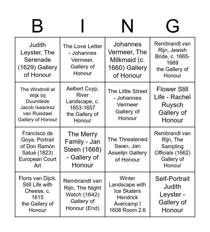 This bingo card has 16 words: Rembrandt van Rijn, The Night Watch (1642) Gallery of Honour (End), Rembrandt van Rijn, The Sampling Officials (1662) Gallery of Honour, Johannes Vermeer, The Milkmaid (c. 1660) Gallery of Honour, Judith Leyster, The Serenade (1629) Gallery of Honour, Francisco de Goya, Portrait of Don Ramón Satué (1823) European Court Art, The Love Letter - Johannes Vermeer, Gallery of Honour, The Threatened Swan, Jan Asselijn Gallery of Honour, Winter Landscape with Ice Skaters Hendrick Avercamp I 1608 Room 2.6, The Windmill at Wijk bij Duurstede Jacob Isaacksz van Ruisdael Gallery of Honour, Aelbert Cuyp, River Landscape, c. 1653-1657 the Gallery of Honour, Floris van Dijck, Still Life with Cheese, c. 1615 the Gallery of Honour, Rembrandt van Rijn, Jewish Bride, c. 1665-1669 the Gallery of Honour, The Merry Family - Jan Steen (1668) - Gallery of Honour, Flower Still Life - Rachel Ruysch Gallery of Honour, The Little Street - Johannes Vermeer Gallery of Honour and Self-Portrait Judith Leyster - Gallery of Honour.