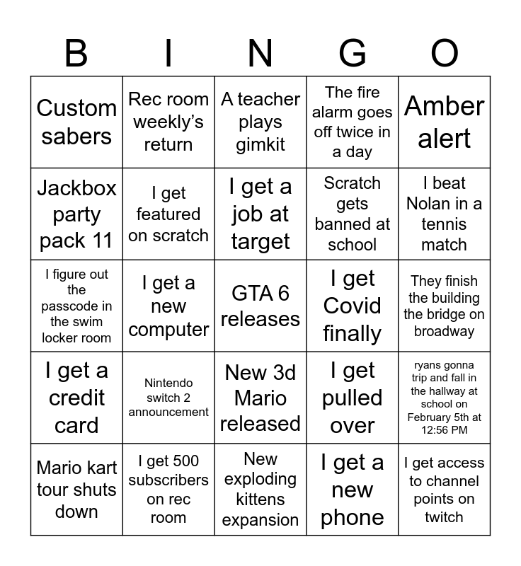 This bingo card has 50 words: Free!, GTA 6 releases, I see a school fight, New exploding kittens expansion, Nintendo switch 2 announcement, I get a hole in one in golf, Rec room weekly’s return, I have my first car crash, Jackbox party pack 11, I get money for cashing out my tokens, I get featured on scratch, The fire alarm goes off twice in a day, ryans gonna trip and fall in the hallway at school on February 5th at 12:56 PM, I get pulled over, Remote day, New Mario kart announcement, I get a job at target, I get Covid finally, Trump gets assassinated, Amber alert, I get a new computer, I get a new phone, Custom sabers, Scratch gets banned at school, I have a lucid dream, I get access to channel points on twitch, I beat Nolan in a tennis match, Tik tok is banned, A teacher plays gimkit, New 3d Mario released, My stopwatch doesn’t stop, I date someone, Dad puts up autumn’s 12 grade photo, Someone finds the Christmas pickle, I get 500 subscribers on rec room, 2 new RRO’s, Make it to midnight becomes fully cloneable, I get inside of a cyber truck, Jackbox survey scramble music releases, They finish the building the bridge on broadway, I leave the state, Wii sports resort rec room event, Blocksword releases, A number between 400-500 wins beast games, Mario kart tour shuts down, I figure out the passcode in the swim locker room, AirPods get a screen, I go to the hospital, I get a credit card and I have the most fakin it wins when school ends.