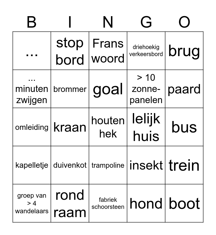 This bingo card has a free space and 64 words: Engels woord, rode auto, kabouter of beeld in tuin, trein, kat, zebrapad, stop bord, caravan of mobilhome, goal, witte garagepoort, trampoline, zitbank (niet in station), bus, brug, fietser met fietshelm, ... minuten zwijgen, kraan, ..., koekje eten, > 10 zonne- panelen, duivenkot, kapelletje, driehoekig verkeersbord, rolluiken, iemand in korte broek, < 10 zonne- panelen, schapen, 3 dingen vertalen in het Frans, brandkraan of electriciteit-box, Oooh moment, gekleurde pijl, jaartal, vlag, ladder, paard, groep van > 4 wandelaars, graffiti, hond, bushalte, brommer, omleiding, lelijk huis, speeltuig, kerk, tractor, boot, rond raam, smeedwerk ijzeren poort, insekt, gele mannen, wist-je datje, houten paletten, fabriek schoorsteen, trein over water, voetbal veld, mobile home of zo, Frans woord, ..., camera, raad mensen die vertrekken, auto aan spooroverweg, wandelaars met hond, mopje vertellen and gebouw van > 10 verdiepen.