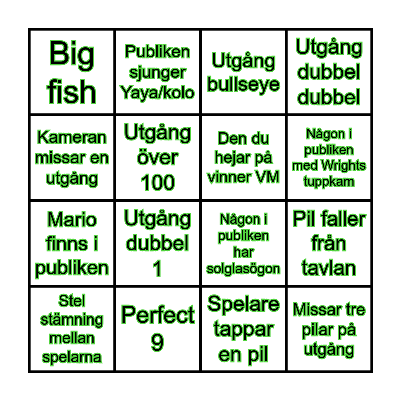 This bingo card has 16 words: Perfect 9, Pil faller från tavlan, Utgång bullseye, Big fish, Mario finns i publiken, Publiken sjunger Yaya/kolo, Någon i publiken har solglasögon, Spelare tappar en pil, Kameran missar en utgång, Utgång över 100, Stel stämning mellan spelarna, Utgång dubbel dubbel, Utgång dubbel 1, Någon i publiken med Wrights tuppkam, Den du hejar på vinner VM and Missar tre pilar på utgång.