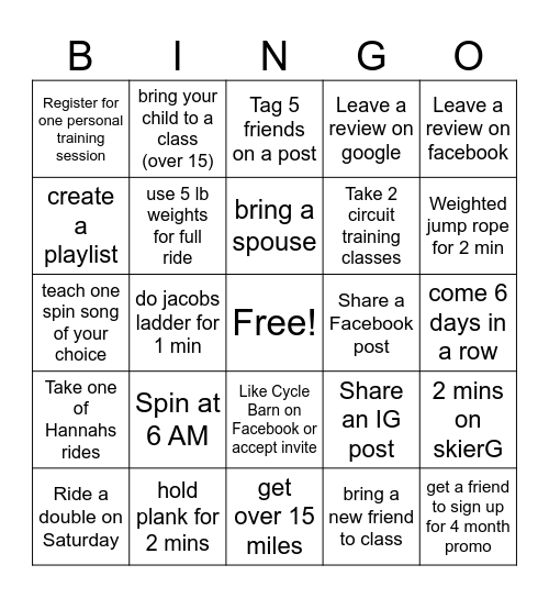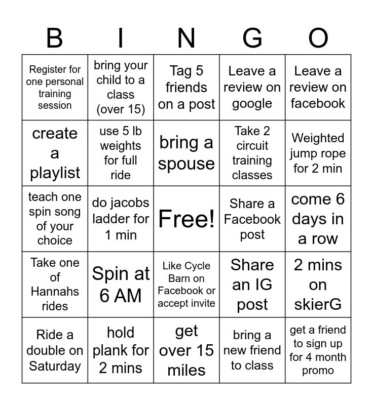 This bingo card has a free space and 24 words: Spin at 6 AM, hold plank for 2 mins, bring a spouse, Ride a double on Saturday, Leave a review on facebook, Register for one personal training session, create a playlist, bring your child to a class (over 15), Share a Facebook post, Like Cycle Barn on Facebook or accept invite, Take 2 circuit training classes, teach one spin song of your choice, Share an IG post, 2 mins on skierG, use 5 lb weights for full ride, bring a new friend to class, come 6 days in a row, Tag 5 friends on a post, Weighted jump rope for 2 min, do jacobs ladder for 1 min, get a friend to sign up for 4 month promo, Take one of Hannahs rides, Leave a review on google and get over 15 miles.