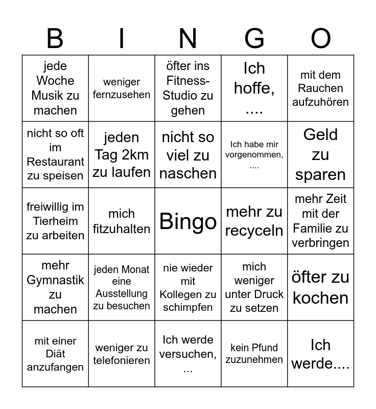 This bingo card has a free space and 34 words: 10 kg abzunehmen, kein Pfund zuzunehmen, weniger Fleisch zu essen, mehr Wasser zu trinken, mehr Gymnastik zu machen, jeden Tag 2km zu laufen, mit dem Rauchen aufzuhören, mit einer Diät anzufangen, weniger fernzusehen, mehr Zeit für Freunde zu haben, nicht so viel zu naschen, öfter ins Fitness-Studio zu gehen, weniger mit dem Auto zu fahren, kein Besteck aus Plastik zu verwenden, mehr zu recyceln, Geld zu sparen, weniger zu telefonieren, freiwillig im Tierheim zu arbeiten, jeden Monat eine Ausstellung zu besuchen, mich weniger unter Druck zu setzen, nie wieder mit Kollegen zu schimpfen, am WE Sport zu machen, jede Woche Musik zu machen, mehr Zeit mit der Familie zu verbringen, Ich werde versuchen, ..., Ich werde...., Ich hoffe, ...., Ich habe vor, ...., Ich habe mir vorgenommen, ...., nicht so oft im Restaurant zu speisen, gesünder zu essen, mich fitzuhalten, öfter zu kochen and mehr zu schlafen.