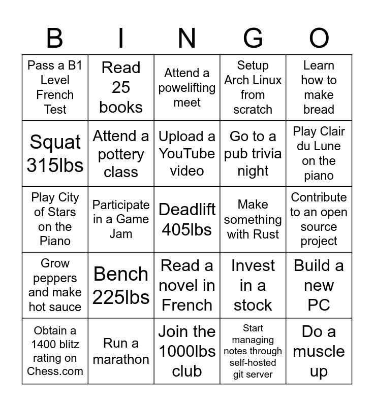 This bingo card has a free space and 24 words: Bench 225lbs, Run a marathon, Upload a YouTube video, Obtain a 1400 blitz rating on Chess.com, Learn how to make bread, Pass a B1 Level French Test, Squat 315lbs, Read 25 books, Make something with Rust, Read a novel in French, Go to a pub trivia night, Play City of Stars on the Piano, Invest in a stock, Build a new PC, Attend a pottery class, Start managing notes through self-hosted git server, Contribute to an open source project, Attend a powelifting meet, Play Clair du Lune on the piano, Participate in a Game Jam, Do a muscle up, Grow peppers and make hot sauce, Setup Arch Linux from scratch and Join the 1000lbs club.