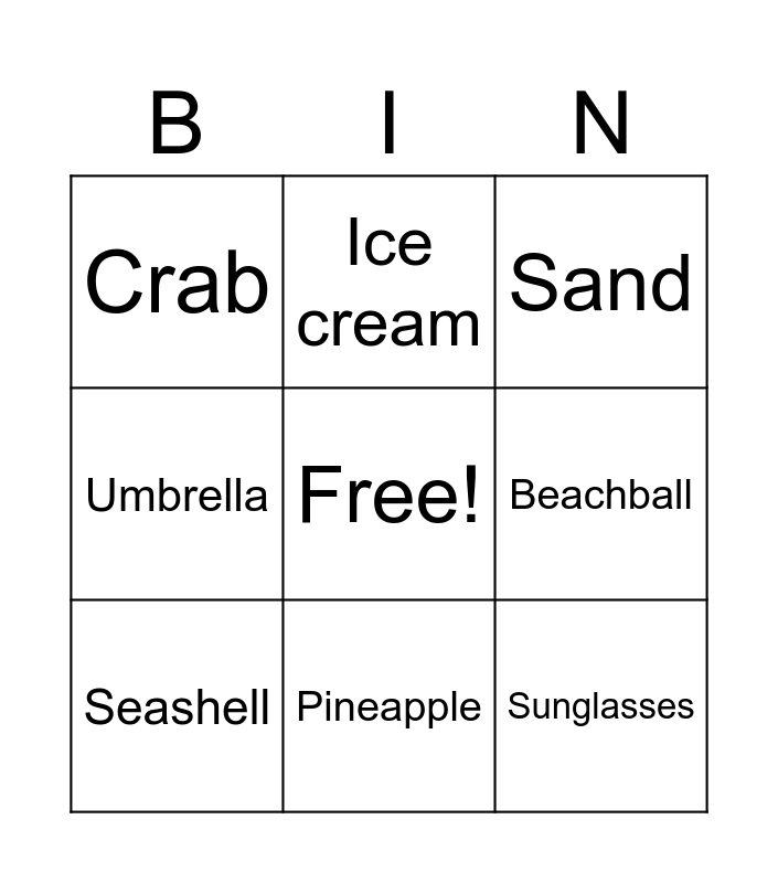 This bingo card has a free space and 8 words: Beachball, Sand, Ice cream, Seashell, Crab, Sunglasses, Umbrella and Pineapple.