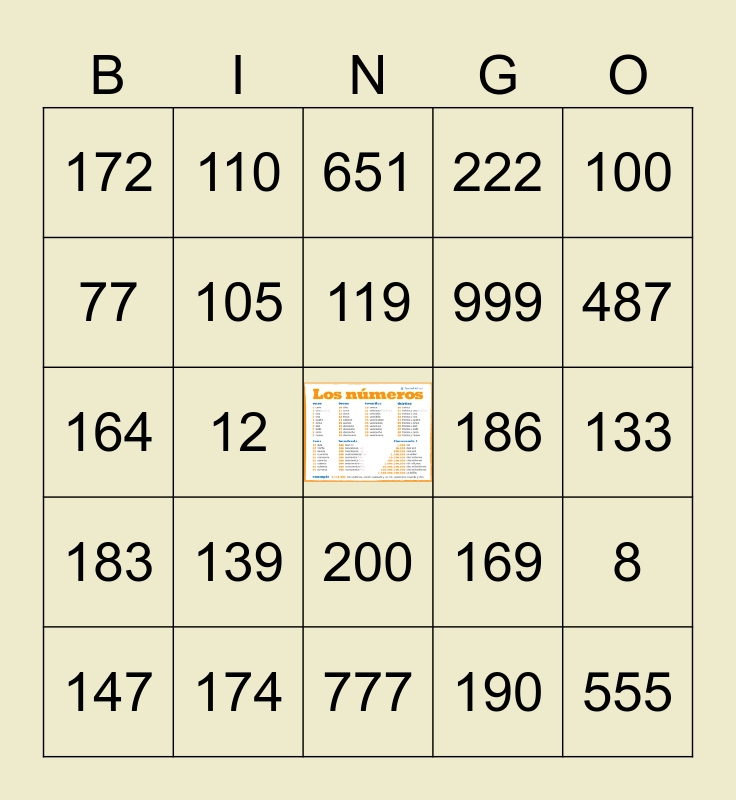 This bingo card has a free space and 34 words: 101, 190, 106, 120, 183, 105, 100, 147, 110, 103, 119, 651, 115, 195, 186, 487, 174, 164, 139, 169, 200, 148, 172, 133, 777, 555, 222, 888, 999, 77, 66, 12, 8 and 333.