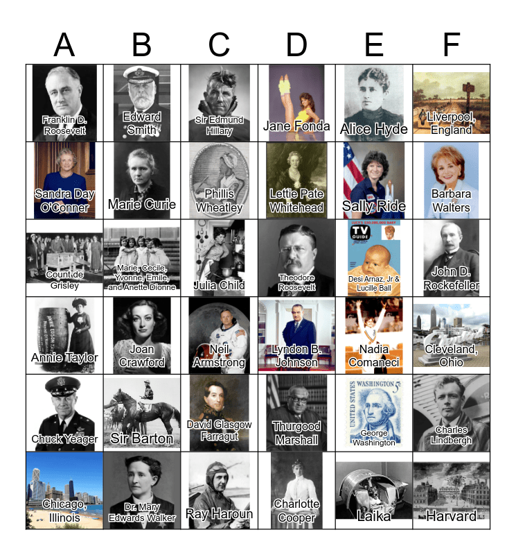 This bingo card has 36 images and 36 words: Thurgood Marshall, David Glasgow Farragut, Charlotte Cooper, Sandra Day O'Conner, Annie Taylor, Theodore Roosevelt, Marie Curie, Ray Haroun, Alice Hyde, George Washington, Barbara Walters, Jane Fonda, Charles Lindbergh, Marie, Cecile, Yvonne, Emile, and Anette Dionne, Lettie Pate Whitehead, Franklin D. Roosevelt, Chuck Yeager, Desi Arnaz, Jr & Lucille Ball, Count de Grisley, Sir Edmund Hillary, Julia Child, Joan Crawford, Lyndon B. Johnson, Neil Armstrong, Nadia Comaneci, Edward Smith, Sally Ride, Dr. Mary Edwards Walker, Phillis Wheatley, Liverpool, England, Harvard, Chicago, Illinois, Cleveland, Ohio, John D. Rockefeller, Sir Barton and Laika.