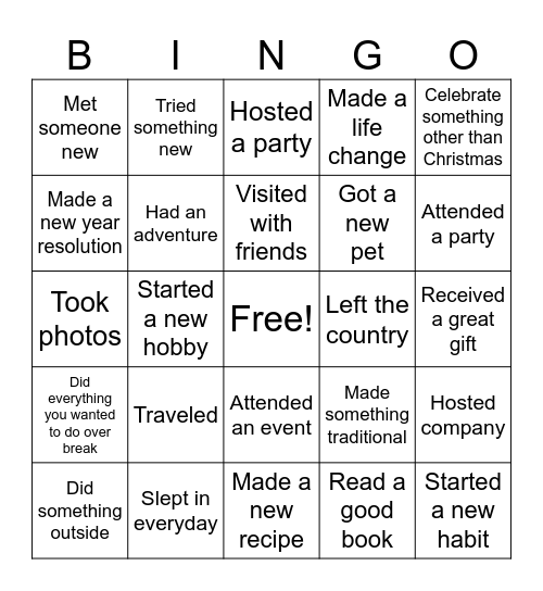 This bingo card has a free space and 25 words: Traveled, Made a new recipe, Visited with friends, Did something outside, Celebrate something other than Christmas, Met someone new, Made a new year resolution, Tried something new, Left the country, Attended an event, Got a new pet, Took photos, Made something traditional, Hosted company, Had an adventure, Watched a good movie, Received a great gift, Hosted a party, Attended a party, Started a new hobby, Started a new habit, Slept in everyday, Did everything you wanted to do over break, Made a life change and Read a good book.