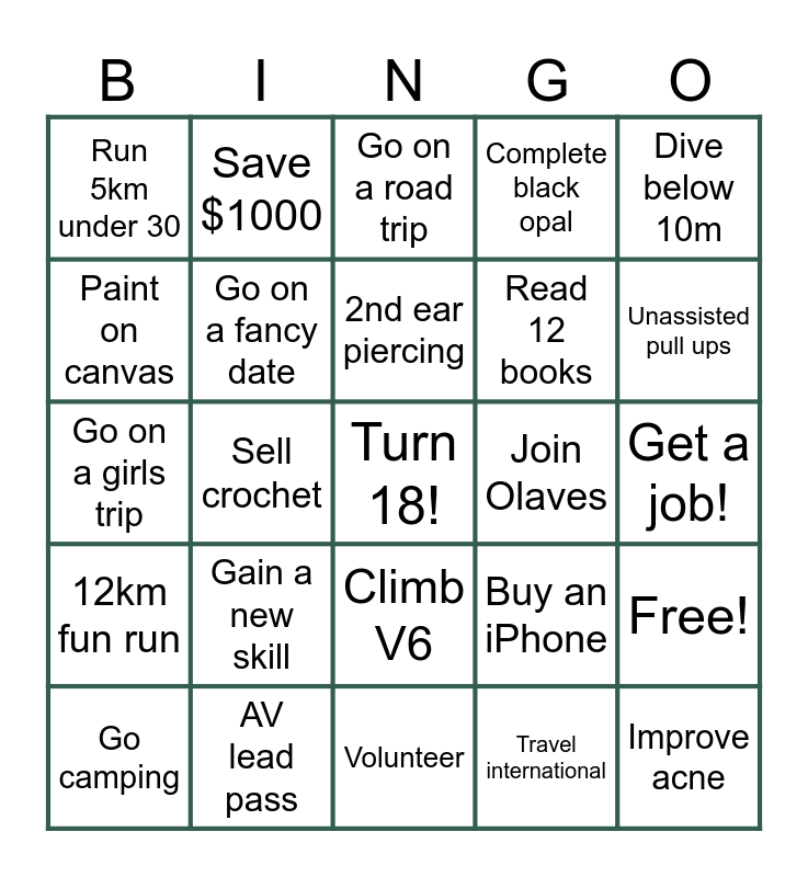 This bingo card has 26 words: Climb V6, Travel international, 2nd ear piercing, AV lead pass, Dive below 10m, Run 5km under 30, Paint on canvas, Save $1000, Get a job!, Buy an iPhone, Read 12 books, Go on a girls trip, Free!, Go camping, Sell crochet, 3+ day hike, Complete black opal, 12km fun run, Go on a road trip, Turn 18!, Unassisted pull ups, Volunteer, Join Olaves, Gain a new skill, Go on a fancy date and Improve acne.