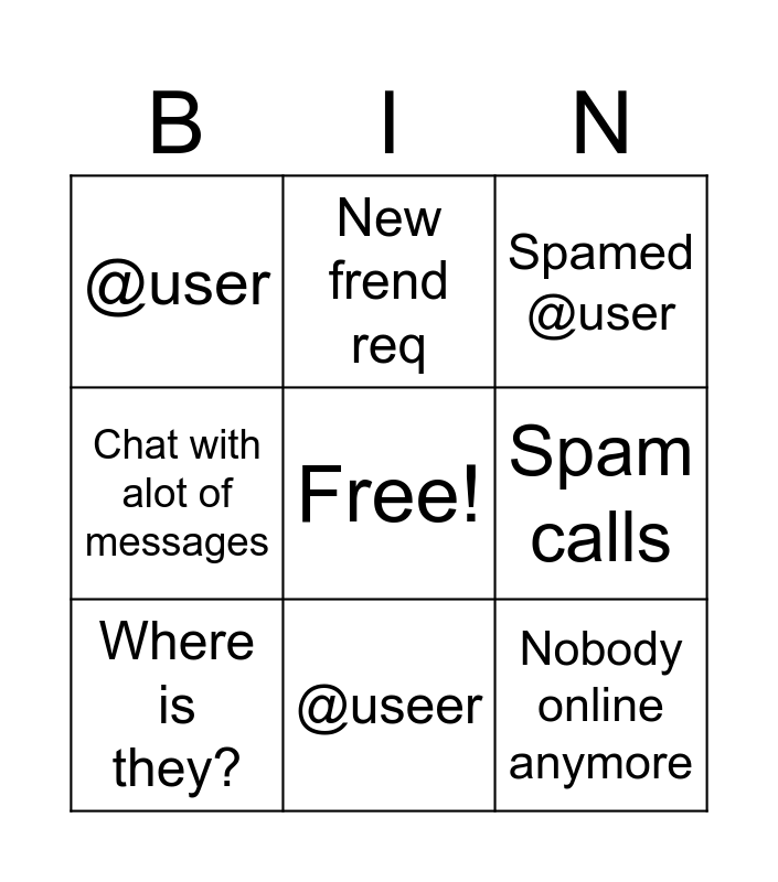 This bingo card has a free space and 9 words: Where is they?, Spamed @user, New frend req, Chat with alot of messages, @user, Spam calls, Nobody online anymore, New profile picture and @useer.