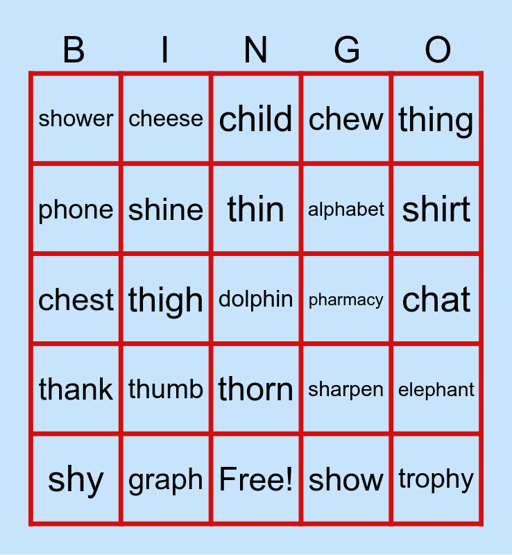 This bingo card has 25 words: thank, graph, dolphin, show, thing, shower, cheese, child, pharmacy, elephant, phone, shine, Free!, sharpen, shirt, shy, thigh, thin, alphabet, chat, chest, thumb, thorn, chew and trophy.