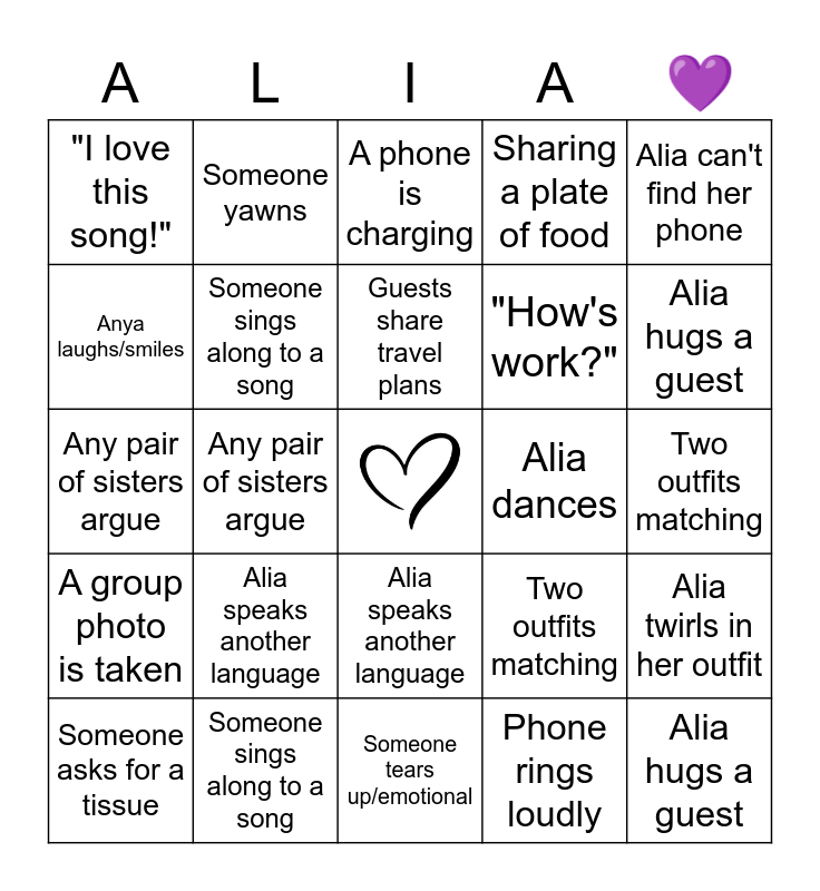 This bingo card has a free space and 48 words: "Mashallah", Alia hugs a guest, Someone asks for a tissue, Someone tears up/emotional, Alia speaks another language, Group photo taken, Someone yawns, Alia says "thank you", Anya laughs/smiles, "Where is the bathroom", Someone sings along to a song, Sharing a plate of food, Alia twirls in her outfit, Two outfits matching, Groom is mentioned, Alia checks her phone, Guests share travel plans, Alia dances, A phone is charging, Alia can't find her phone, Any pair of sisters argue, Phone rings loudly, "I love this song!", "How's work?", "Mashallah", Alia hugs a guest, Someone asks for a tissue, Someone tears up/ emotional, Alia speaks another language, A group photo is taken, Someone yawns, Alia says "thank you", Anya laughs/ smiles, "Where is the bathroom?", Someone sings along to a song, Sharing a plate of food, Alia twirls in her outfit, Two outfits matching, Groom is mentioned, Alia checks her phone, Guests share travel plans, Alia dances, A phone is charging, Alia can't find her phone, Any pair of sisters argue, Phone rings loudly, "I love this song!" and "How's work?".