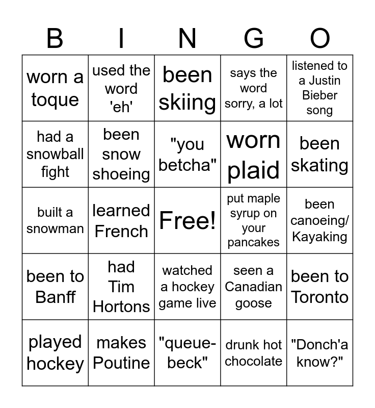 This bingo card has a free space and 24 words: had Tim Hortons, makes Poutine, "you betcha", played hockey, listened to a Justin Bieber song, worn a toque, had a snowball fight, used the word 'eh', put maple syrup on your pancakes, watched a hockey game live, worn plaid, built a snowman, seen a Canadian goose, been to Toronto, been snow shoeing, drunk hot chocolate, been canoeing/ Kayaking, been skiing, been skating, learned French, "Donch'a know?", been to Banff, says the word sorry, a lot and "queue-beck".