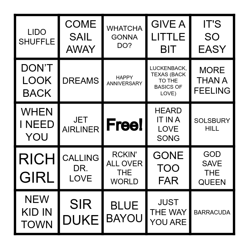 This bingo card has a free space and 48 words: BABY, WHAT A BIG SURPRISE, BARRACUDA, BLACK BETTY, BLUE BAYOU, CALLING DR. LOVE, COLD AS ICE, COME SAIL AWAY, DANCING QUEEN, DON’T LOOK BACK, DON'T STOP, DREAMS, GIVE A LITTLE BIT, GOD SAVE THE QUEEN, GONE TOO FAR, GOODBYE GIRL, HANDY MAN, HAPPY ANNIVERSARY, HEARD IT IN A LOVE SONG, IT'S A HEARTACHE, IT'S SO EASY, JET AIRLINER, JUST THE WAY YOU ARE, LIDO SHUFFLE, LUCKENBACK, TEXAS (BACK TO THE BASICS OF LOVE), MARGARITAVILLE, MORE THAN A FEELING, NEW KID IN TOWN, NOBODY DOES IT BETTER, RCKIN' ALL OVER THE WORLD, RICH GIRL, ROCKAWAY BEACH, SENTIMENTAL LADY, SHE'S NOT THERE, SHORT PEOPLE, SIR DUKE, SLIP SLIDIN' AWAY, SO INTO YOU, SOLSBURY HILL, TELEPHONE LINE, THE KING IS GONE, THE THINGS WE DO FOR LOVE, WE ARE THE CHAMPIONS, WHATCHA GONNA DO?, WHAT'S YOUR NAME, WHEN I NEED YOU, YOU AND ME, YOU LIGHT UP MY LIFE and YOU'RE IN MY HEART.