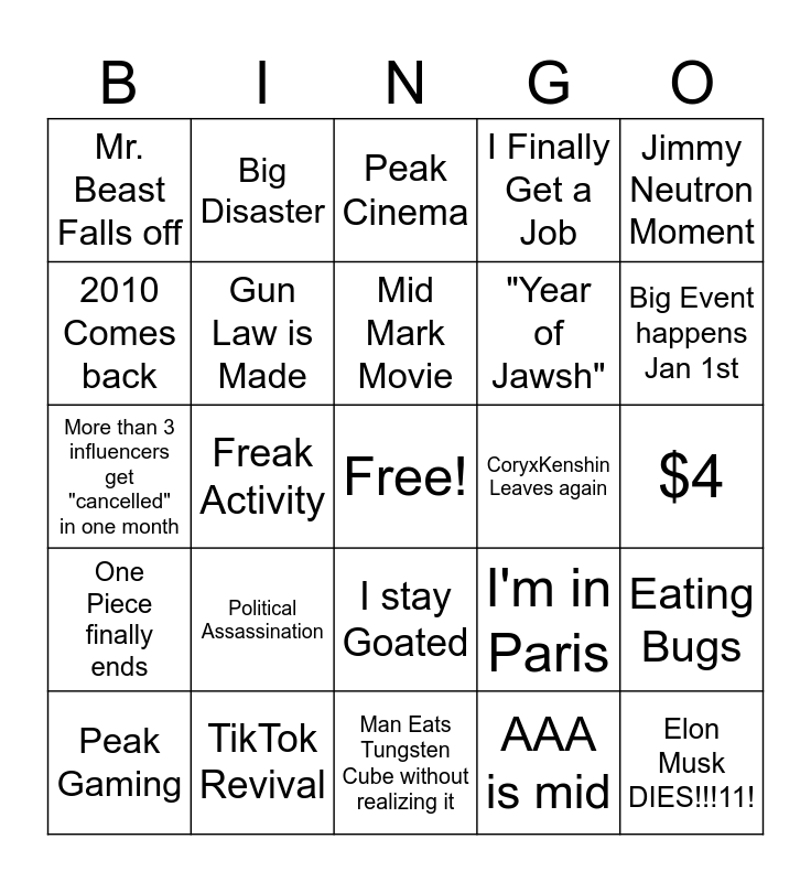 This bingo card has a free space and 24 words: Political Assassination, TikTok Revival, Mid Mark Movie, Peak Gaming, Jimmy Neutron Moment, Mr. Beast Falls off, 2010 Comes back, Big Disaster, CoryxKenshin Leaves again, I stay Goated, "Year of Jawsh", More than 3 influencers get "cancelled" in one month, I'm in Paris, Eating Bugs, Gun Law is Made, AAA is mid, $4, Peak Cinema, Big Event happens Jan 1st, Freak Activity, Elon Musk DIES!!!11!, One Piece finally ends, I Finally Get a Job and Man Eats Tungsten Cube without realizing it.