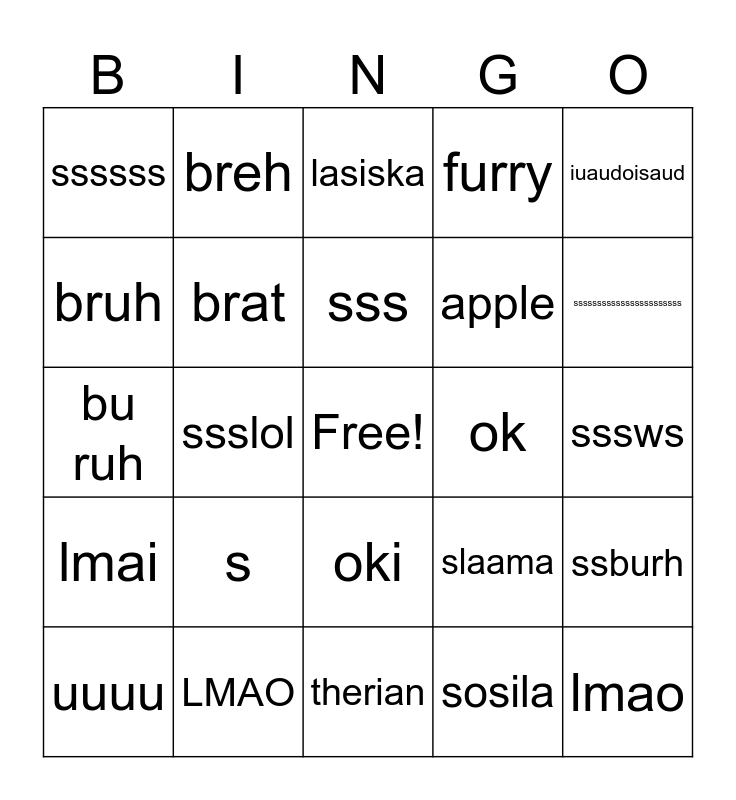 This bingo card has a free space and 24 words: s, LMAO, sss, uuuu, iuaudoisaud, ssssss, bruh, breh, ok, oki, apple, bu ruh, slaama, ssburh, brat, sosila, sssws, lasiska, sssssssssssssssssssssss, ssslol, lmao, lmai, furry and therian.